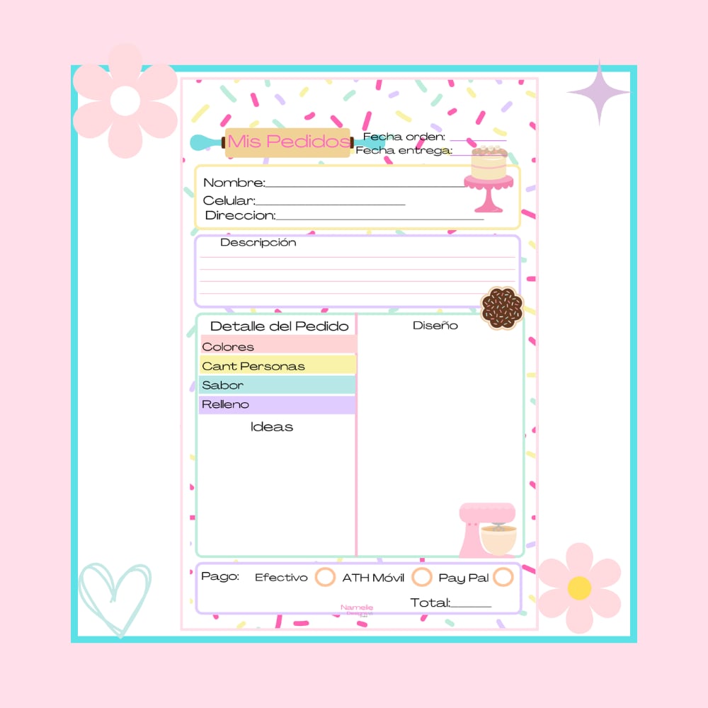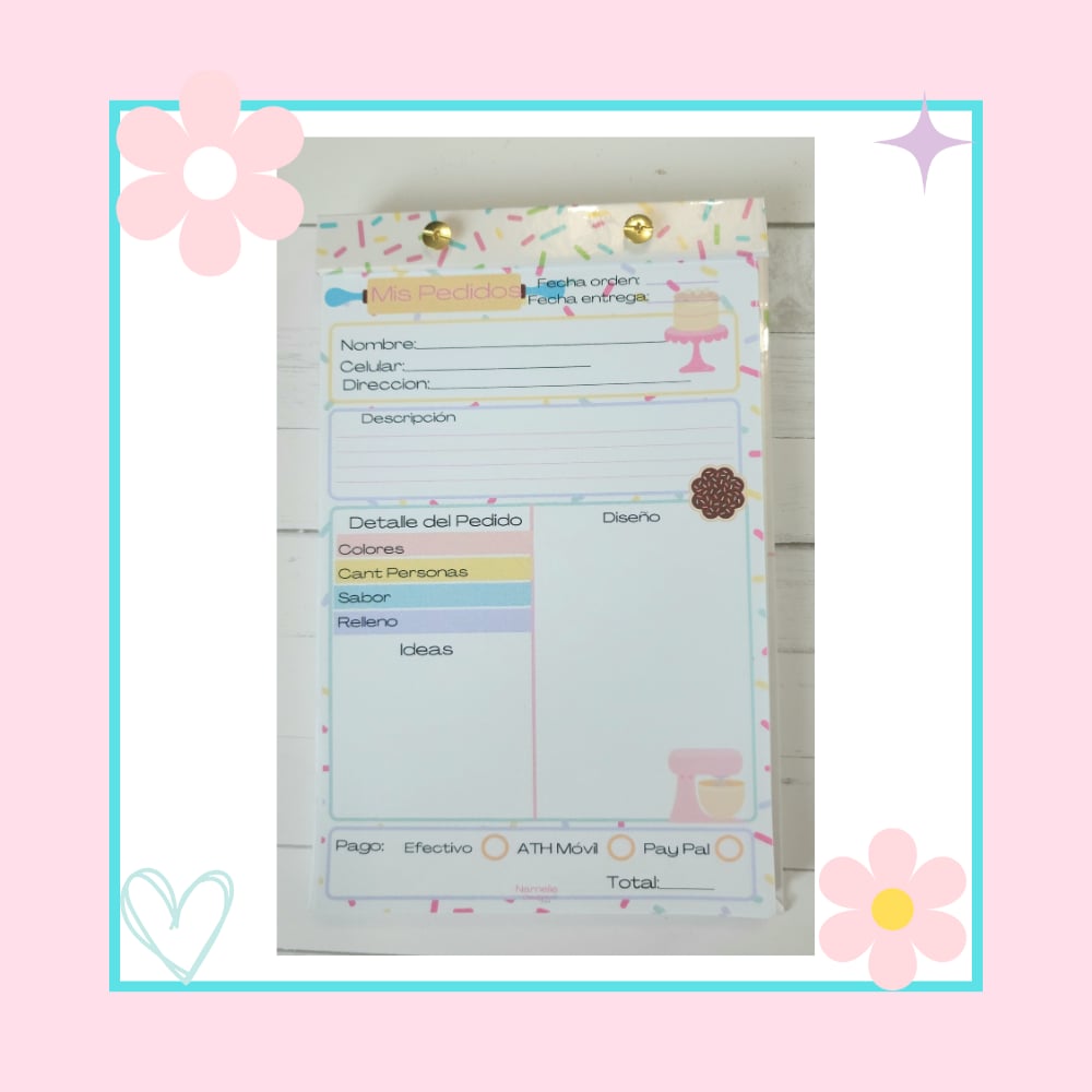 Libreta de pedidos para Pastry Chef ideal para anotar y organizar encargos de pasteles y postres. Permite registrar datos del cliente, fecha de entrega, sabores, tamaños, decoración y precio, ayudando a llevar un mejor control del trabajo y evitar errores en cada pedido.Carpeta dura que puedes reusar luego puedes ordenar solo las hojas.